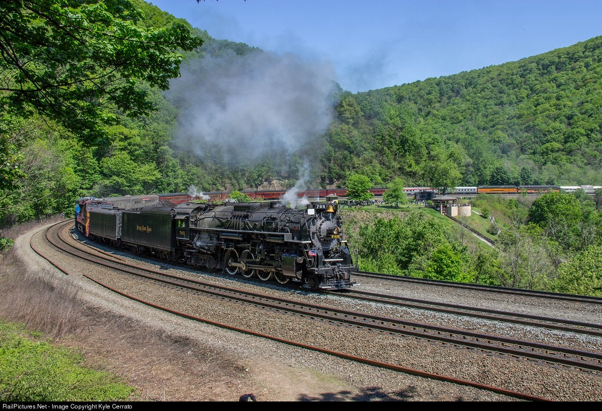 | It is hard to believe that just a year ago the whole railfanning world was focused on one weekend of events, 765 operating public excursions in central PA. The highlight of the trip was the chance to go around the world famous Horseshoe Curve, making this the first public steam excursion to do so in years. Here, NKP 765 proudly steams around the curve as thousands watch in awe. |