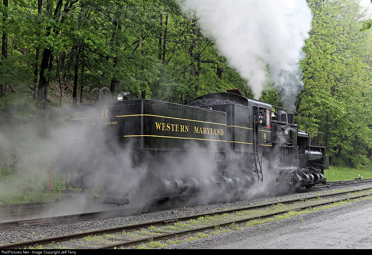 Is it ever not raining at Cass? Her switching chores completed, Western Maryland Shay 6 scoots down towards the Cass shop to be put away for the night.