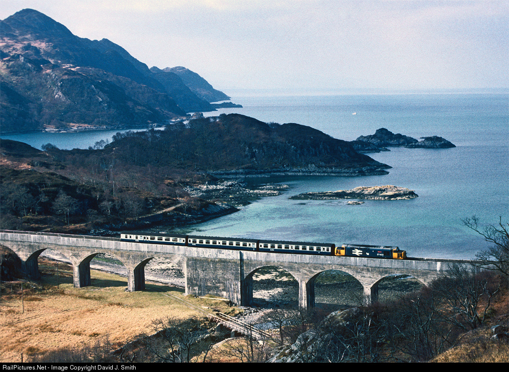 | A classic Scottish West Highland Line scene - Class37 No. 37403 "Isle of Mull" crosses the viaduct at Loch nan Uamh with a Fort William to Mallaig working in April 1986.It was from the waters in the background that Bonnie Prince Charlie sailed for France in September 1746,after the failed Stuart rebellion of the previous year. |