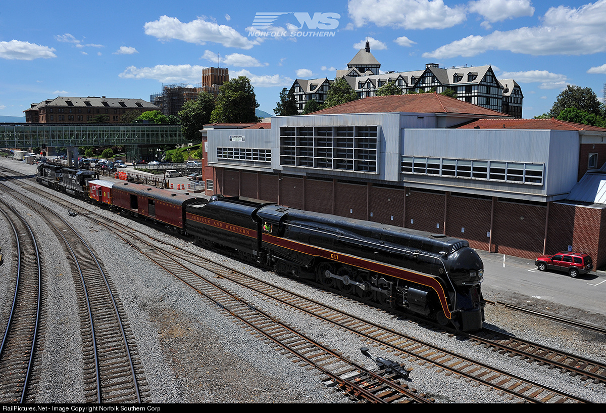 Norfolk and Western class J number 611 departed its display location of 20 years today at 2pm. The special train shoved east from the VMT connection track, all the way downtown, to the O Winston Link Museum, to eventually weave its way across the yard. The OWL Museum is the former N&W passenger station, and has seen the J-class locomotives pass by quite a few times during its lifetime. Be sure to visit www.fireup611.org and contribute to the restoration of 611, so the next time we see this scene, it will be running under its own steam! Photo by Casey Thomason. For more information about Norfolk Southern, visit www.nscorp.com