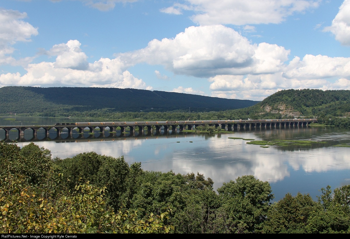 As seen from above, Norfolk Southern train 11J rolls across the massive Rockville Bridge bringing empty autoracks out of New Jersey.
