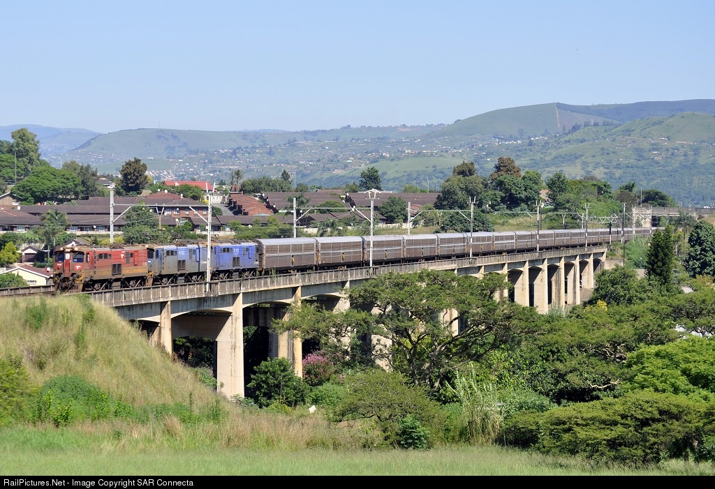 It's mid morning on a sweltering summer day in Pietermaritzburg, as 18-506 crosses the Pentrich Viaduct with a double stack Car Train bound for Bayhead in Durban.