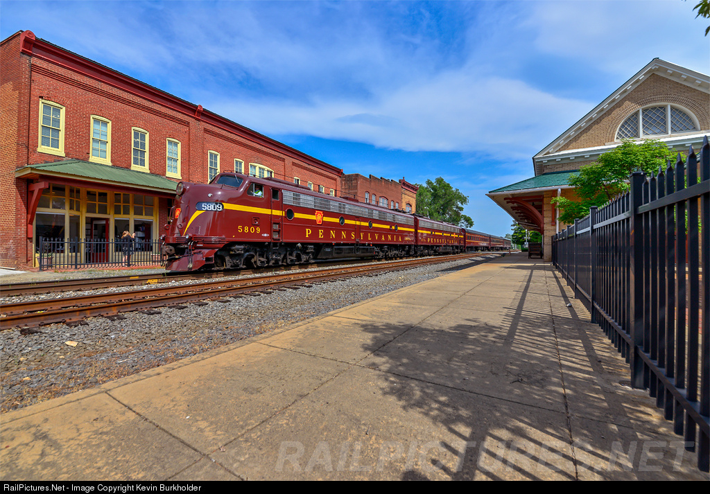 Running as the Norfolk Southern special train 045P127, Bennett Levin's train of pristine Pennsylvania Railroad varnish - complete with pair of E8As that were PRR, Conrail and PRR again - is seen splitting buildings in Orange, Virginia on May 28, 2014. The train is enroute to the Streamliners event in Spencer, North Carolina.
