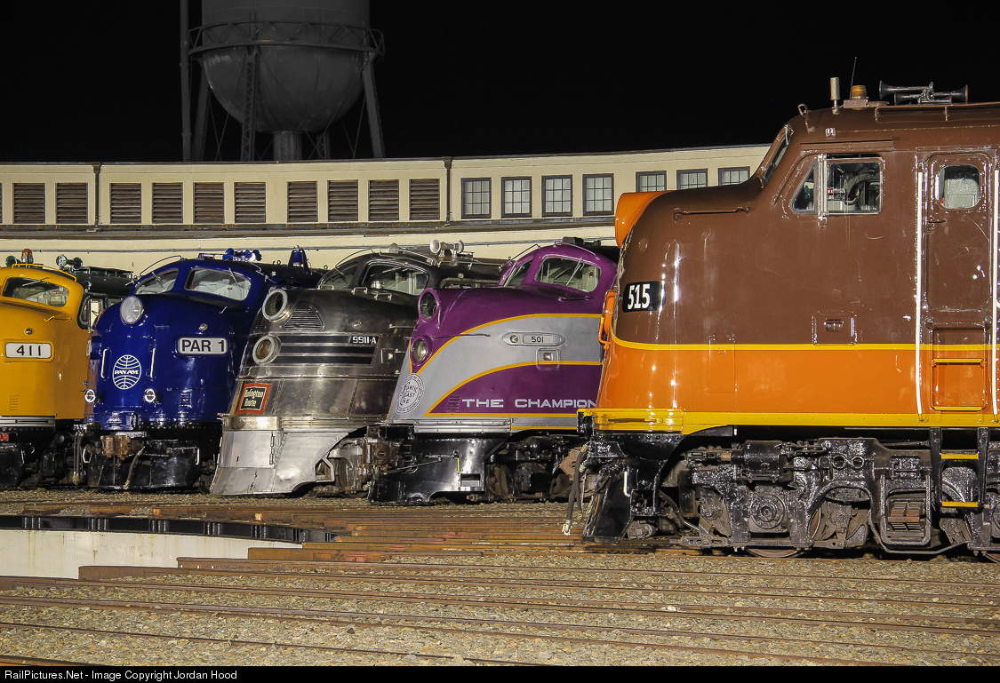 A wide variety of cab units gather around the Bob Julian Roundhouse for the first night's photo shoot, ranging from an E8 in Illinois Central garb to a CNW F7.
