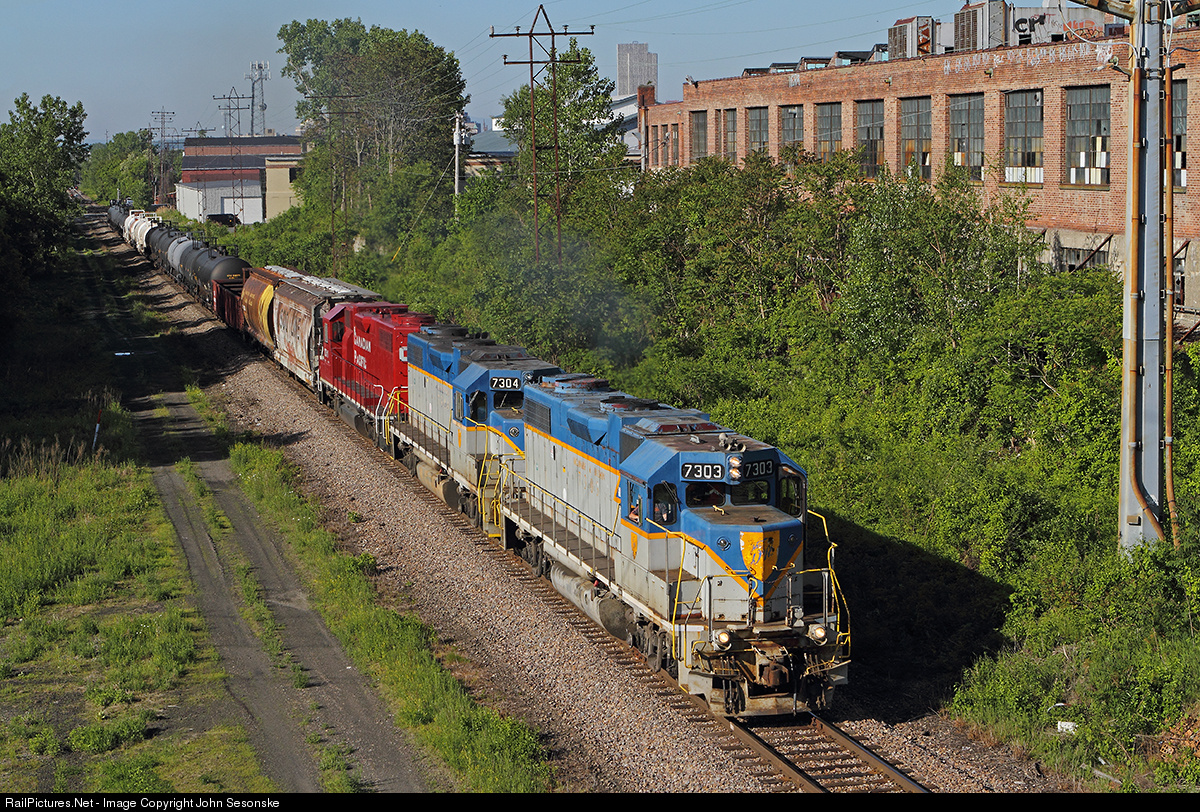 | Rolling NB just out of downtown Albany, Sunday's Saratoga to Kenwood (Albany) turn job is again lead by the last 2 D&H lightning stripes. Albany's Corning Tower can be seen in the upper middle of the scene. Trailing units are DH 7304 and CP 7311. All 3 engines are ex Lehigh Valley, acquired by the D&H in 1976 when Conrail was created and proudly serving the D&H for the last 38 years. |