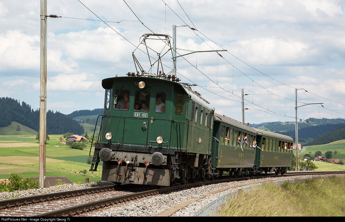 The 4 axle (Bo'Bo') locomotive Be 4/4 # 102 of the Emmental-Burgdorf-Thun-Bahn (EBT) was built in 1932 by SLM and SAAS for the Emmentalbahn. Today with BLS Stiftung (foundation for the preservation, maintenance and operation of the vehicles of the former BLS and their predecessor railways). Special train with two authentic cars of the former EBT in the s-curve near Mirchel between Konolfingen and Grosshöchstetten on the occasion of the celebration of "150 years railway in Konolfingen".