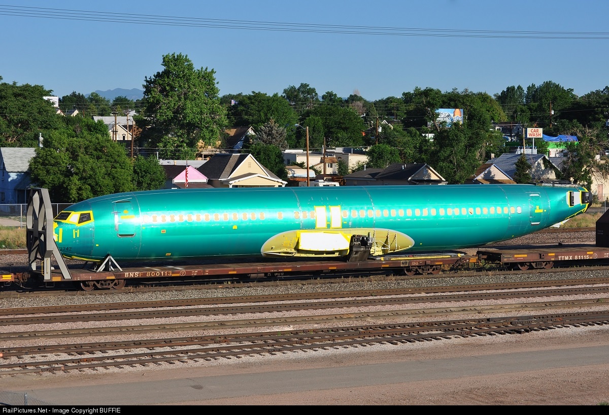 During the summer of 2011, when floods wreaked havoc with rail service in the Midwest, the BNSF hauled Boeing 737-800 fuselages through Denver. This particular plane now flies for Delta Airlines. The blue/green anti corrosion coating on the fuselage looks very similar to the aotake color that the Japanese used to primer aircraft during WWII.