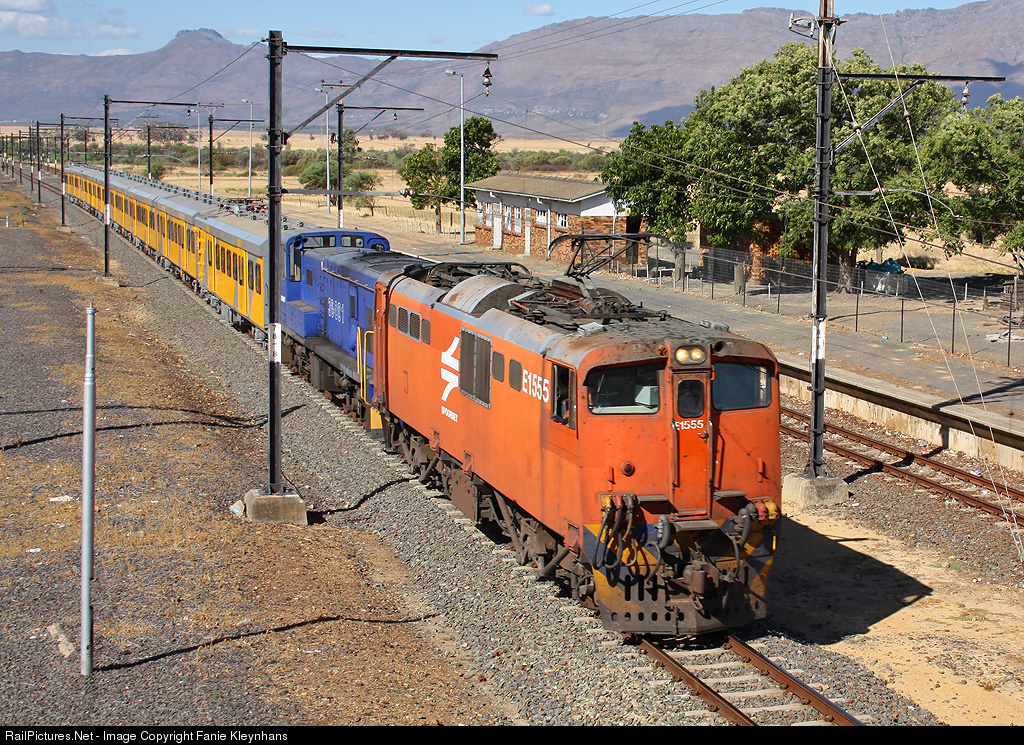 | E1555 tows a dead class 36 and some Metro coaches that they went to fetch at the workshop at Touwsrivier, returning back to Cape Town through Hermon here. |