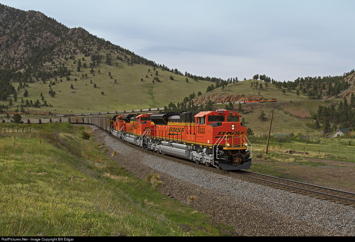 Clean as a whistle! Three new SD70ACes lead a loaded coal train east between Tunnel 1 and Big Ten Curve on the Front Range in a break from foul spring weather. This is their first eastbound trip and one could literally smell the fresh paint as they past.