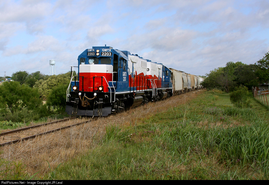 Back in business! Having made a remarkable recovery following a dramatic bridge fire and subsequent collapse, Heart of Texas Railroad has proven to be resilient. The bridge fire was caught on video that quickly went viral on the internet. Heart of Texas Railroad began operations in January of 2013 following the auction of the bankrupt Gulf, Colorado & San Saba Railroad. The fire and collapse of the lengthy Colorado River bridge came shortly after, in May of 2013. Down time after the fire was spent repairing track, upgrading bridges and spraying weeds. Operations resumed in May of 2014 following completion of the impressive new bridge and with it, new power in a striking paint scheme. Here, two of the freshly painted HTR units lead an outbound train toward BNSF interchange in Lometa.