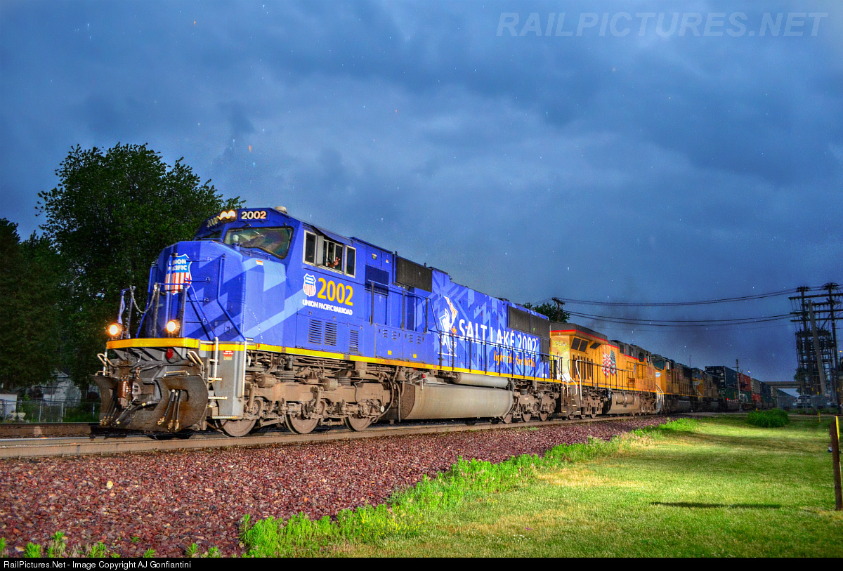 UP 2002, the Salt Lake City Olympic's unit is on the point of westbound hot shot Z-LTG2 on a dreary June evening.