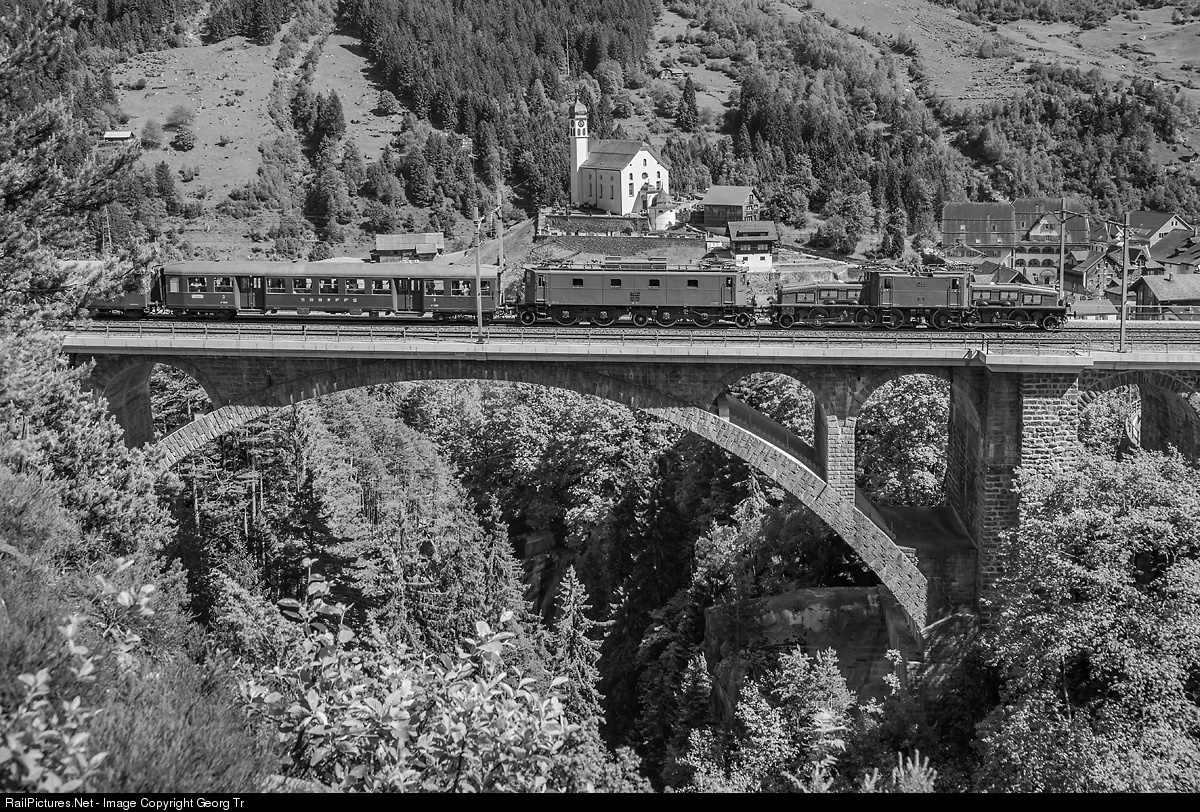 | "Crocodile" Ce 6/8 II # 14253 from Erstfeld is leading Be 4/7 # 12504 over the middle Meienreuss bridge in Wassen. Both locomotives date from the electrification of the Gotthard line nearly 100 years before, the Be 4/7 for express trains and the Ce 6/8 II for freight trains. The middle Meienreuss bridge was a truss bridge then and was rebuilt in concrete blended with granit stones about 60 years ago.