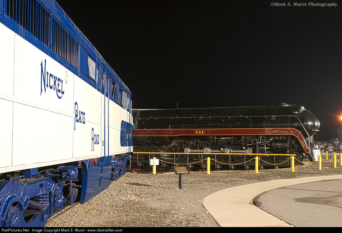 | Many photographers were having exposure difficulty with brilliantly painted PA1 at the "Streamliners at Spencer" night photo shoot, especially while trying to compensate for a black locomotive such as 611. My technique around that was an HDR stack of six exposures, to bring the extremes back into a more manageable range. |