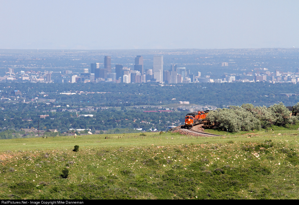 An eastbound BNSF manifest freight passes by the old hopper car windbreak at Big 10 Curve west of Rocky, Colorado, on the afternoon of June 9, 2014. In the background is the city of Denver which is 16 miles away “as the crow flies” on this nice, clear Monday afternoon.
