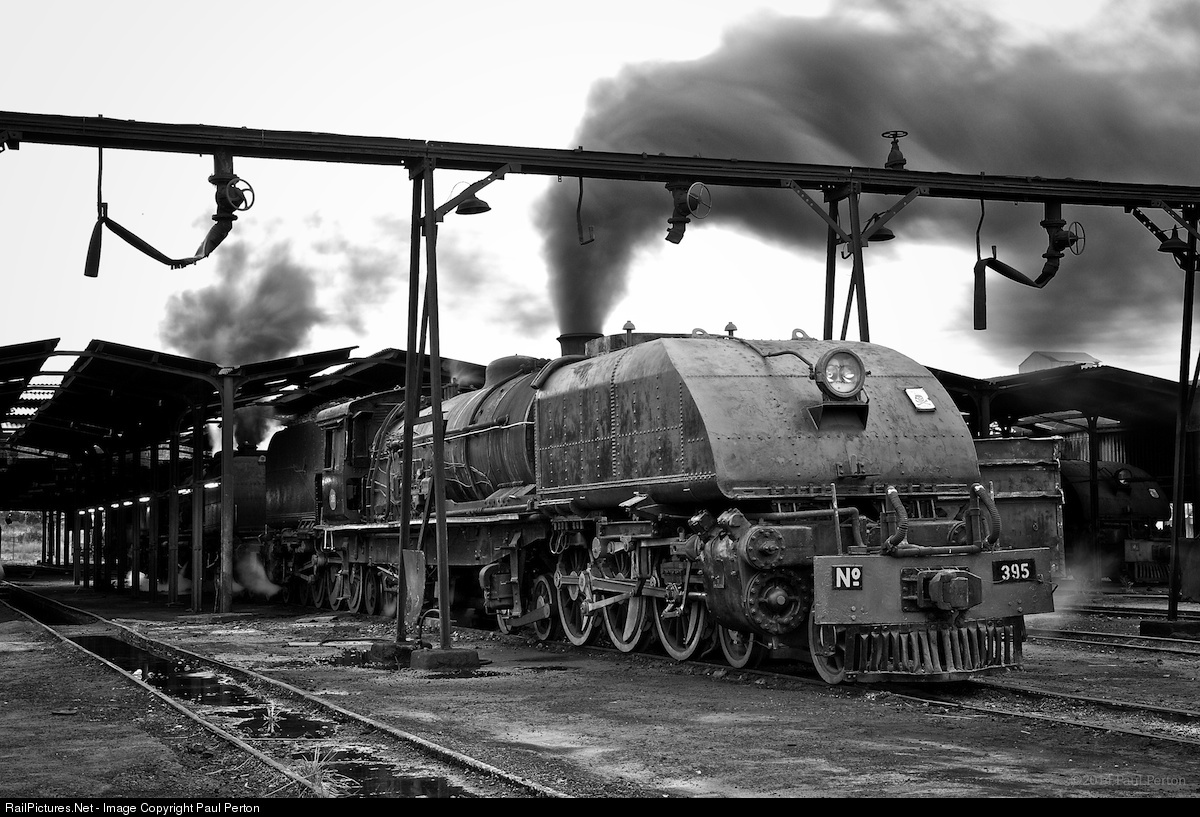 15th class 4-6-4+4-6-4 Garratt no. 395 stands on shed at Bulawayo. At the time of shooting, this is one of only three Garratts still in use - the balance of the once 100-strong fleet has either been scrapped, abandoned, or is being cannibalised for spares.