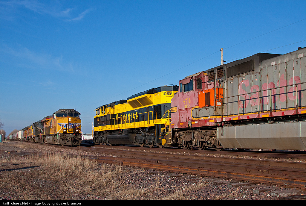 Meet Virginian. A southbound UP grain train meets Virginian heritage unit-led empty crude oil train ONUEU at Warnock on UP's Chester Subdivision. The VGN was sitting crewless in a line of northbounds waiting to get into Alton and Southern's Gateway Yard in East St. Louis, IL. Besides NS 1069, other cool power in this shot includes former ATSF warbonnet C40-8W #874, a patched SP unit, and a UP C40-8.
