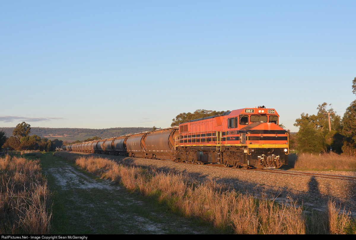 | The last few minutes of daylight near Mundijong sees DBZ2304 race along towards Kwinana with 6222 loaded alumina train from Calcine. |