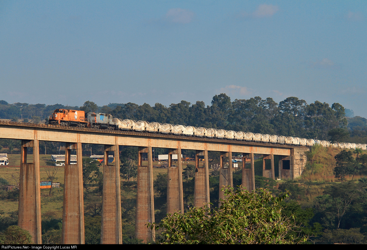 | Cement train Y401 double heading BB40-3 locomotives, running from Ribeirão Preto to Orlândia, crossing the viaduct at km 351. |
