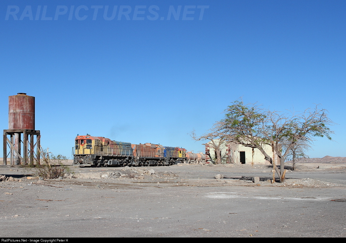 | Up to the 1960ies this former station has an important role as water station for the steam engines of the FCAB. Nowadays the steam is gone and the diesel locos are running through the station without a stop. EMD GR12UD #1408, Clyde G22 #1434 and EMD GR12UD #1402 are hauling a sulphuric acid train in direction of Calama and the big Chuquicamata copper mine |