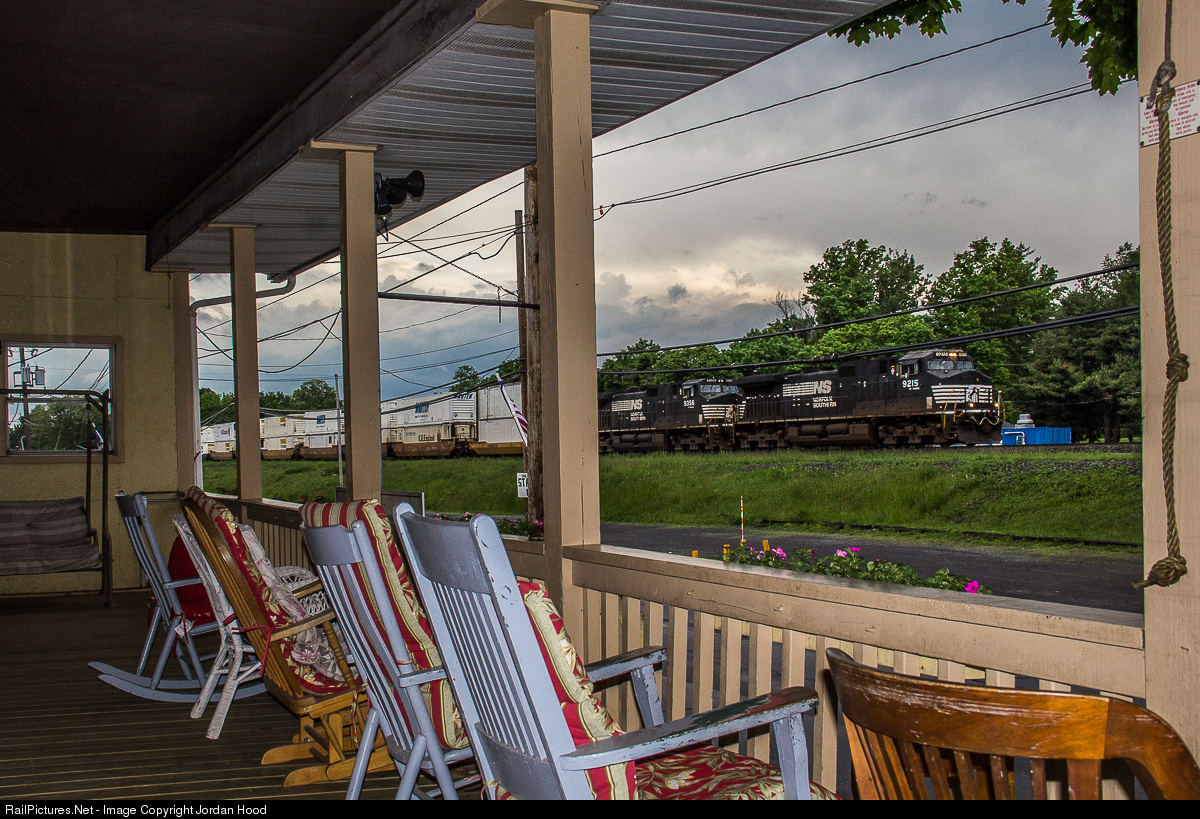 | Front Porch View: An eastbound intermodal passes by the Cresson Station Inn's famed front porch, a popular hangout for railfans to socialize and enjoy the heavily trafficked former Pennsy mainline. |