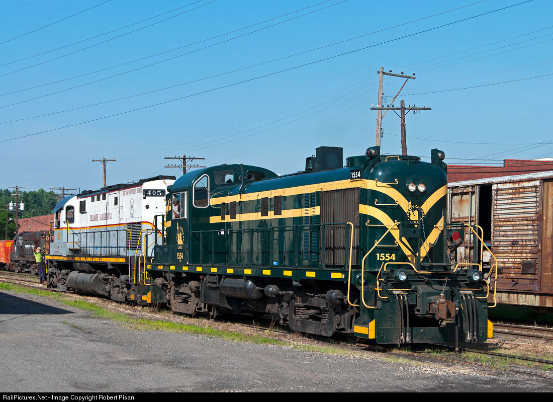 A Delaware-Lackawanna shop crew uses the beautifully-restored former Jersey Central RS-3 1554 to move DL C420 405 into the shop for repairs.