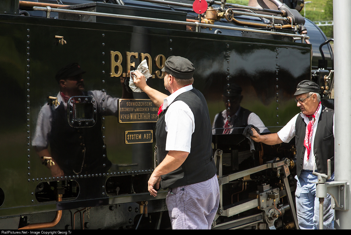Cogwheel steamlocomotive HG 3/4 # 9 from 1914, lettered as "BFD 9" (Compagnie Suisse du chemin de fer de la Furka Brigue-Furka-Disentis"), has to be polished to a high gloss for the second leg of the journey from Oberwald to Brig on the occasion of the stockholders meeting. Nice teamwork of two very experienced and well known steam enthusiasts.