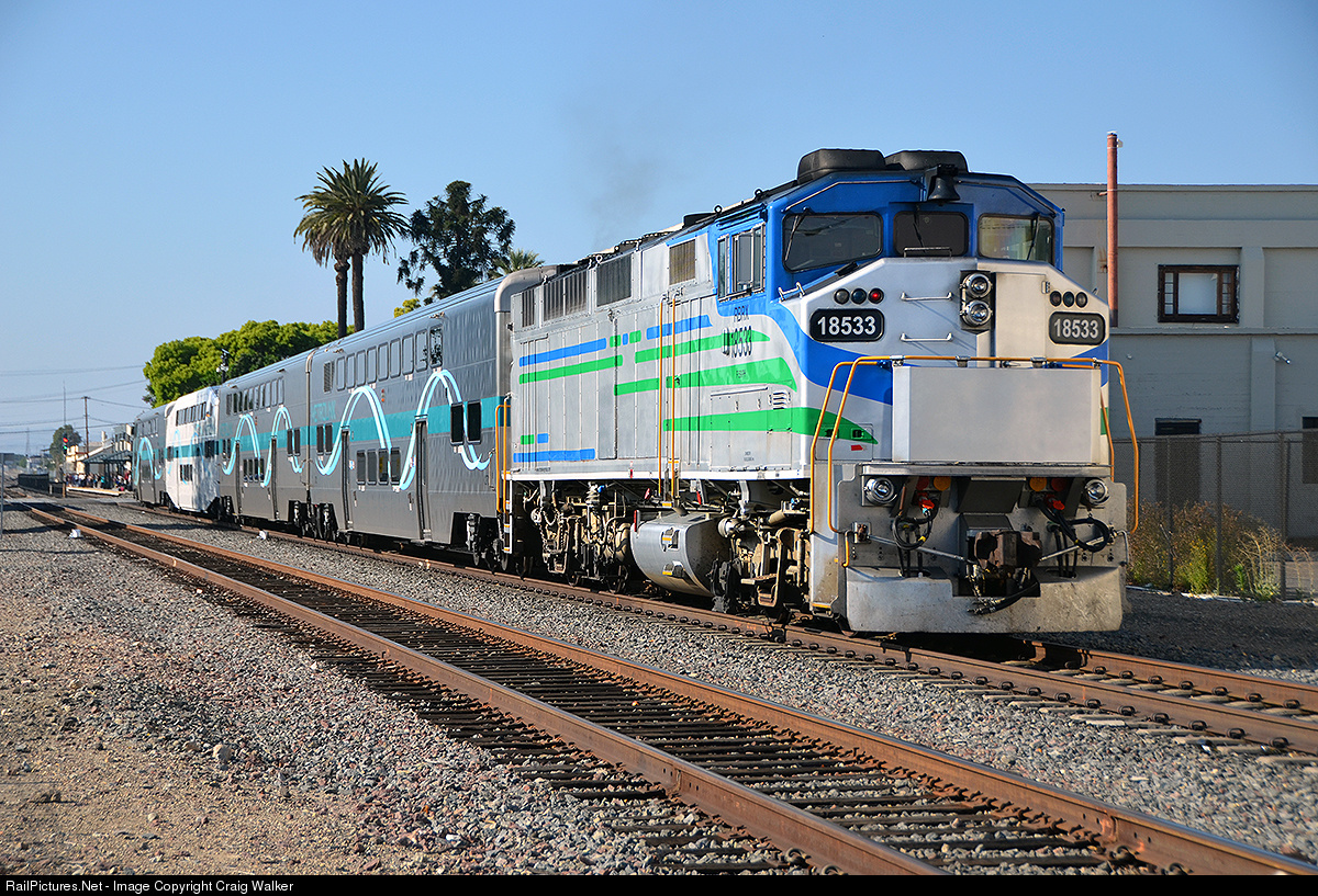 On July 1st, 2014, Metrolink train #689 (Irvine CA to Los Angeles CA) approaches the Orange, California, station. Train #689 includes two unique pieces of equipment in its consist: Coach 187 (the only Bombardier coach to wear the new scheme) and, for power, uniquely-painted Rosen Beaudin Group (RBRX) 18533. This locomotive is an ex-GO Transit F59PH (GOT 533) that was sold to a commuter agency in Detroit, Michigan (MITRAIN) that never got off the ground, and is painted in that agency's colors. While Metrolink rotates power out for Positive Train Control (PTC) antenna installation, they have leased three former GP units from Rosen Beaudin Group - but the other two are still in GO Transit's colors.