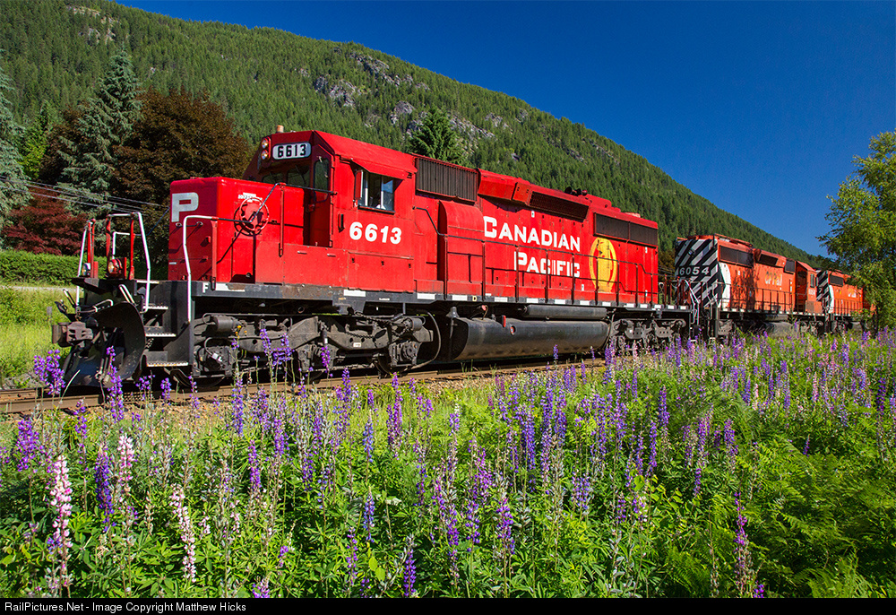The westbound Kootenay Valley Railway hotshot, led by ex-SOO SD40-2 6613 rumbles through Shoreacres, the former siding now overgrown by flowers. Much of the Boundary Subdivision is in such a state, but not many places are this beautiful!