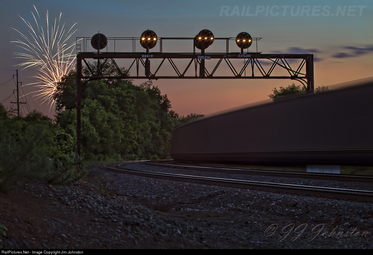 | On a beautiful Summer evening the fireworks show, from the DelGrosso's Amusement Park, celebrating the Nation's birthday and the park's 100th anniversary illuminate the former Pennsy signal bridge. An westbound empty coal train approaches on what may be the last Summer these signals guard this line. |