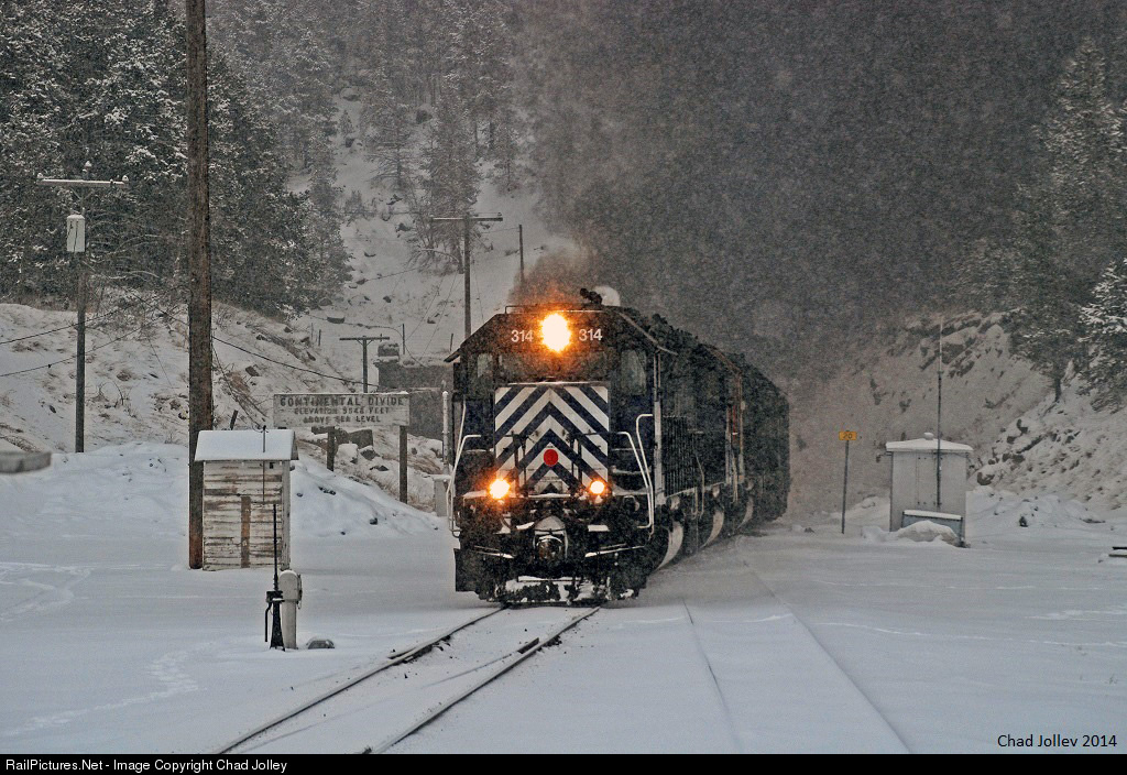 MRL Unmanned helper 314 has the duty of bringing this MLAUPAS over Montana Rail Links Mullan Pass. The snow is starting to pile up at Blossburg as the train slowly grinds over the top of the divide.