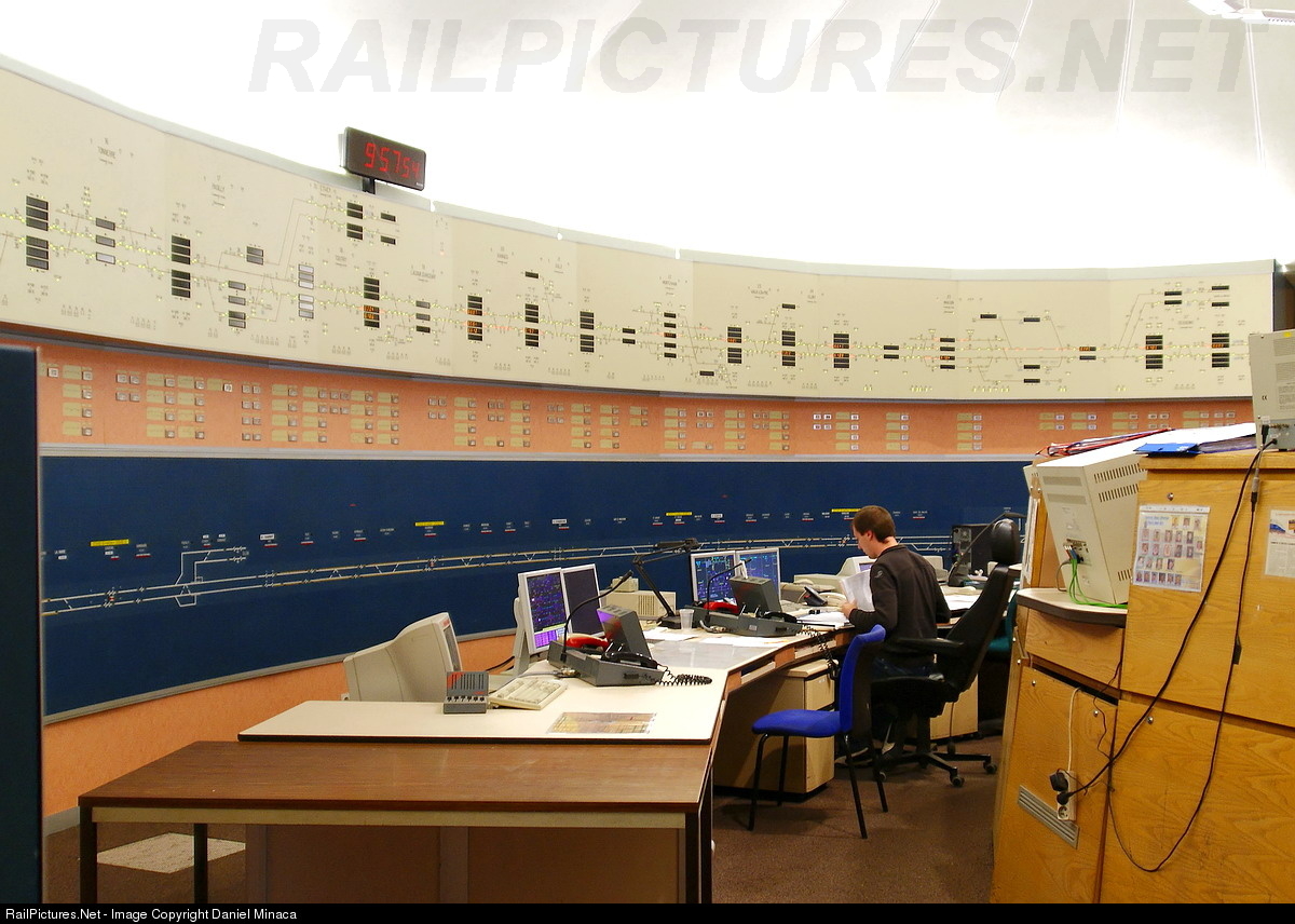 This is the command center for Paris/Lyon South East high speed line. This center is named PAR for "Poste d’Aiguillage et de Régulation" in French, switches regulation center in English. On this location all the traffic of high speed trains on New Line 1 (LN1 in French) is supervised and managed. On the upper display board all trains are traced with their ID, on the lower blue display board all the electric power stations are managed. The phones on the operator table are for communicate with high speed trains drivers to give instructions in case of problems. This command center was built in 1979 and only computers and some electronics parts have been changed or modernised ! Nothing more...