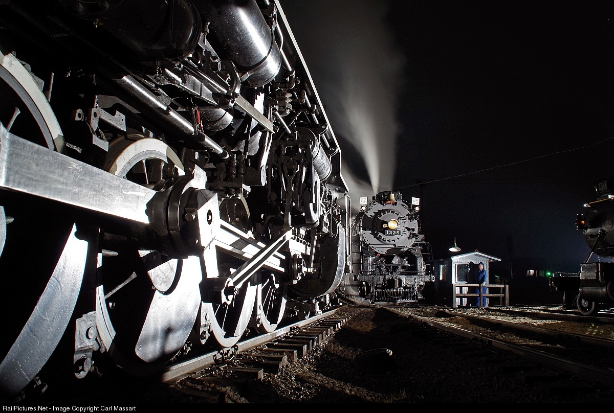 NKP 765's driving gear glistens in the night as PM 1225 simmers at the ready on the turntable. A Lerro Productions photo event.