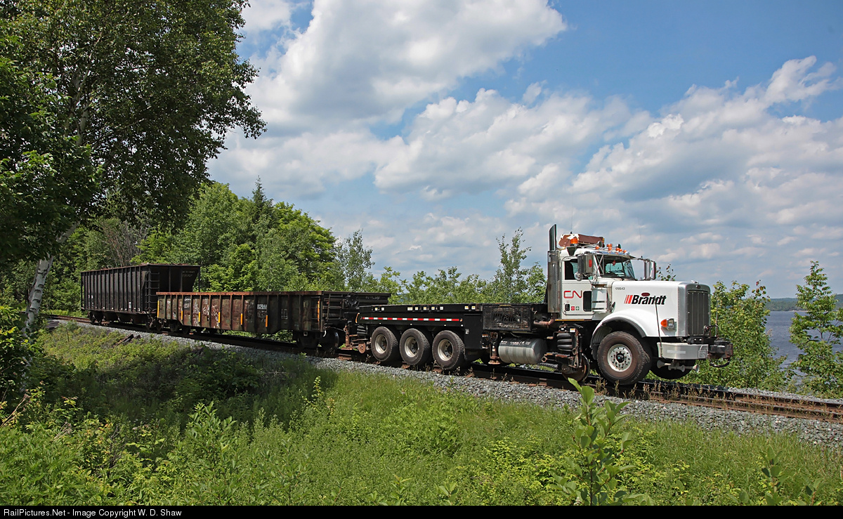 Massive upgrades to CN's Newmarket Sub have brought all kinds of different equipment to the area recently. This Peterbilt Brandt RTL (Road Transferable Locomotive) along with a Mack have been busy doing all kinds of jobs including everything from bringing timbers for grade crossing refurbs to ferrying ballast hoppers and tie gons up and down the line, as seen here coasting downgrade by mile 144 with Lake Vernon in the background.
