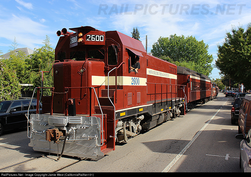 Santa Cruz Big Trees & Pacific CF7 #2600 leads the Chiggen Special through the street running section of Chestnut St. in Santa Cruz heading for the Roaring Camp Railroad in Felton.