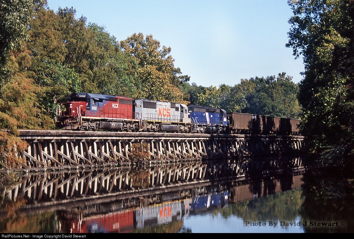 | A mix of lease power could be found across the KCS system during 2004 and 2005, one such mix of power is seen on a westbound manifest as it crosses Bayou Crew in Crew Lake, La. on KCS's Speedway. |