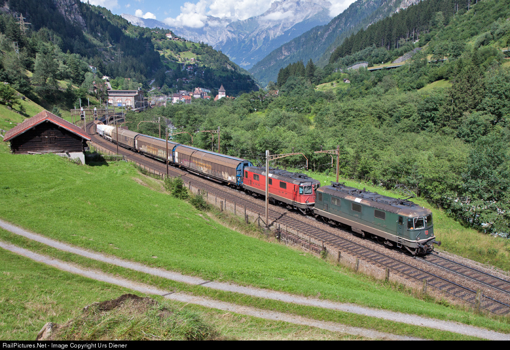 | The still green painted Re 4/4 II 11309 and the red painted sister 11261 with a mixed freight train on the Gotthard north ramp. |