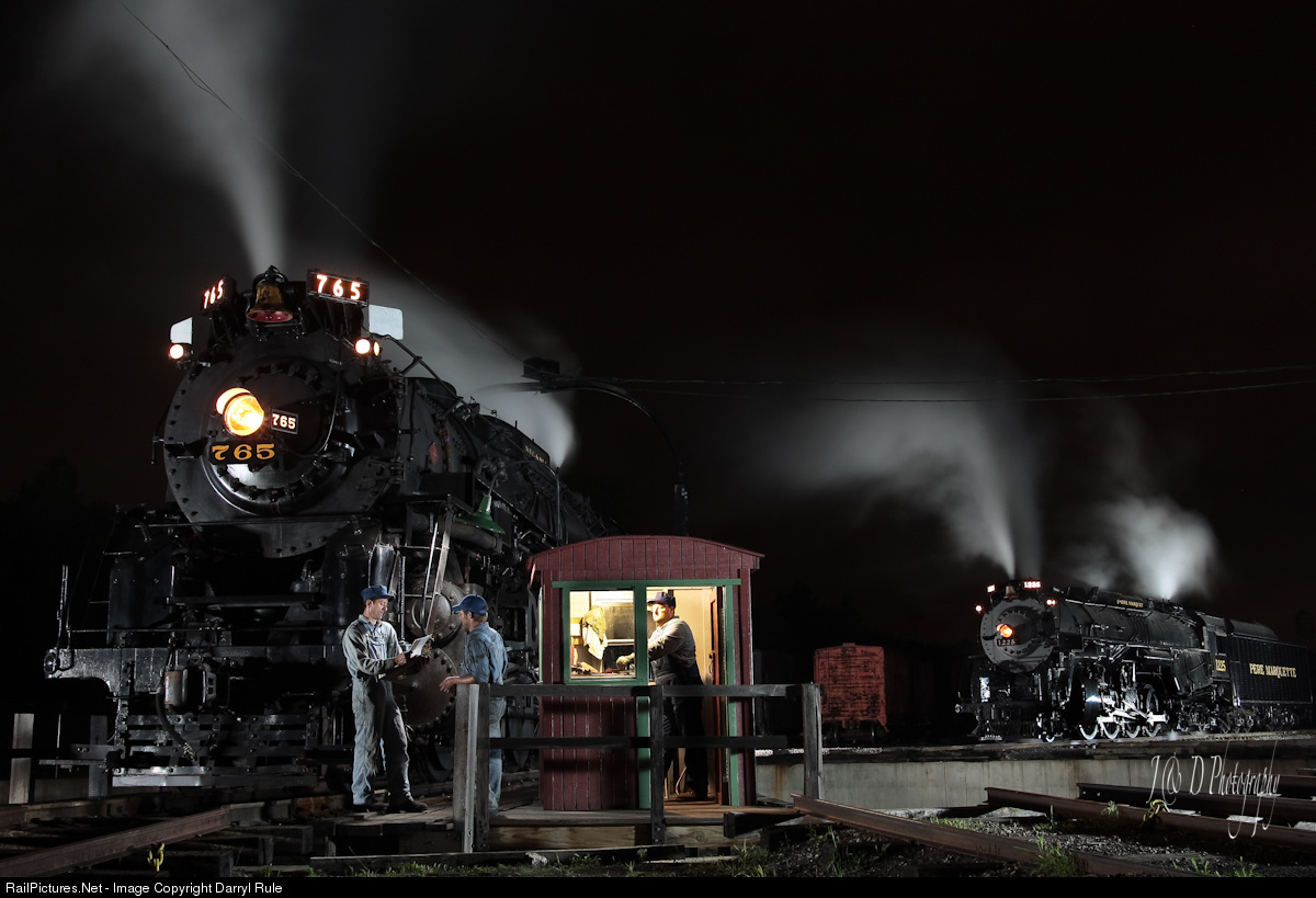 | As Nickel Plate 765 simmers on the turntable, the night crew reviews their orders or the night. In the distance Perre Marquette Berk 1225 awaits servicing. |