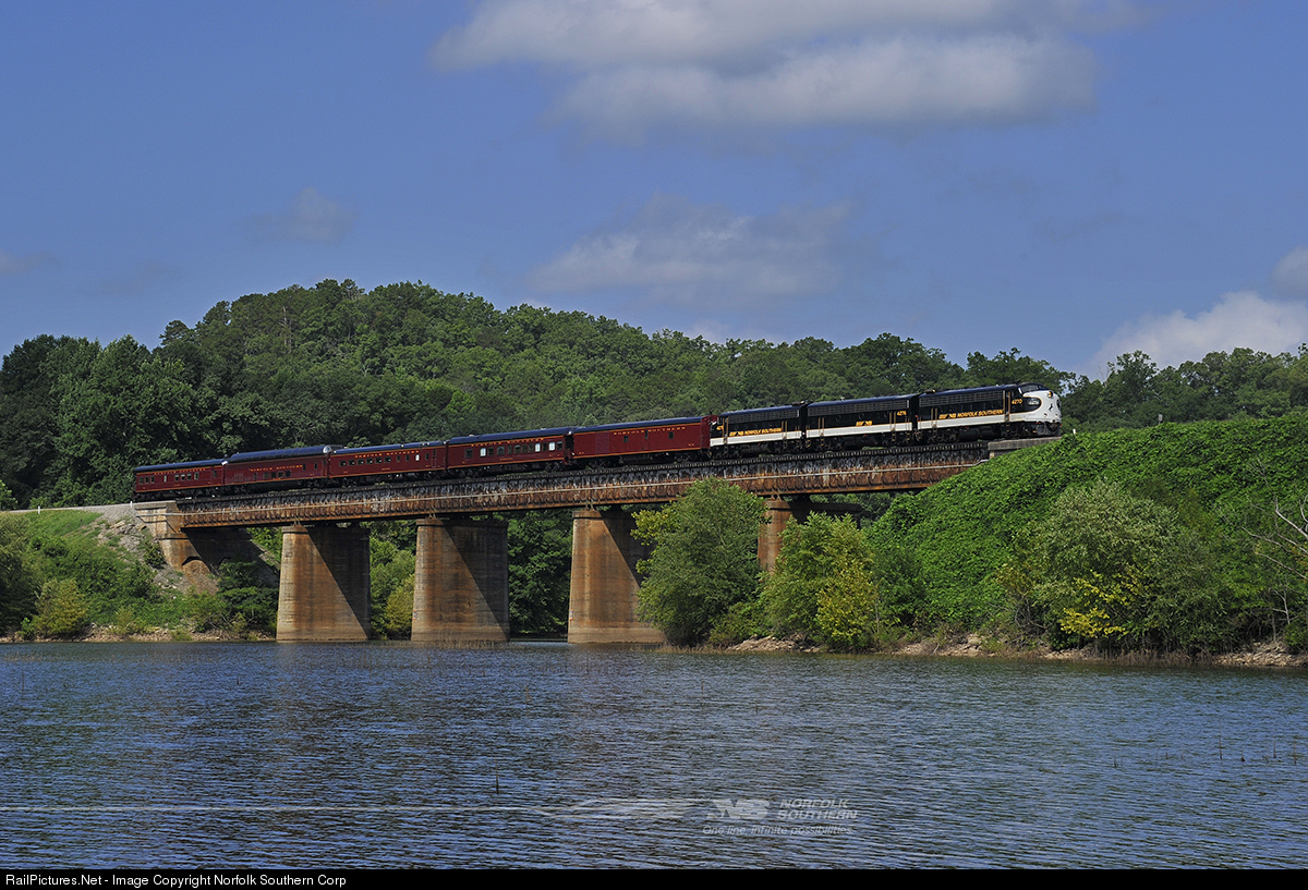 Norfolk Southern F9a 4270, F7b 4276, and F9a 4271 leads a 5 car "office car special" across the Tugaloo River near Toccoa, GA. The head end of the train has just crossed into South Carolina, while the rear is still in Georgia. The train was in Atlanta for an event the day before, and is deadheading back towards its "home" in Altoona, PA. Photo by Casey Thomason. For more information about Norfolk Southern, visit www.nscorp.com