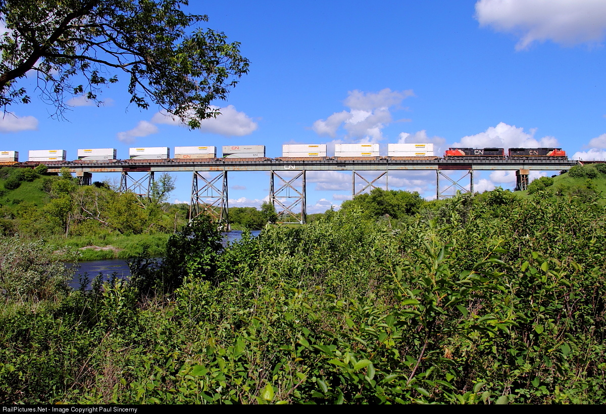 CN's Q114 crosses the Little Saskatchewan River as it departs Rivers for Winnipeg and points east.