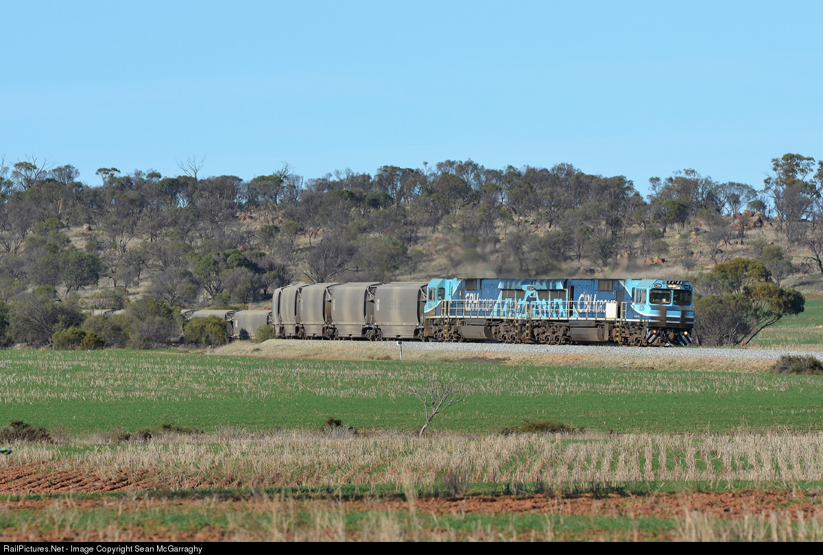 | As they near the township of Wongan Hills, CBH005 & CBH004 roll downhill alongside a farmer's paddock with 5K23 empty grain to McLevie. |