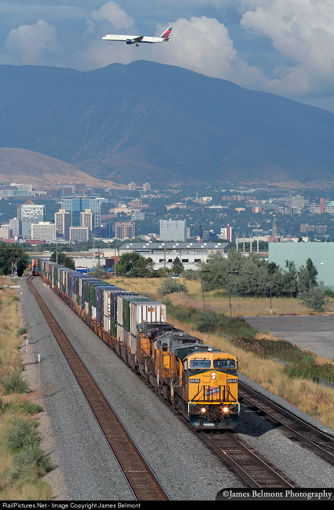 One of the two remaining Chicago & North Western painted and numbered engines on the UP was assigned to lead the KG1LAC-27 from Chicago, Illinois to City of Industry, California. The CNW 8646 approaches the Salt Lake City Intermodal Terminal from downtown while one of the many afternoon Delta flights prepares to land at Salt Lake International Airport.