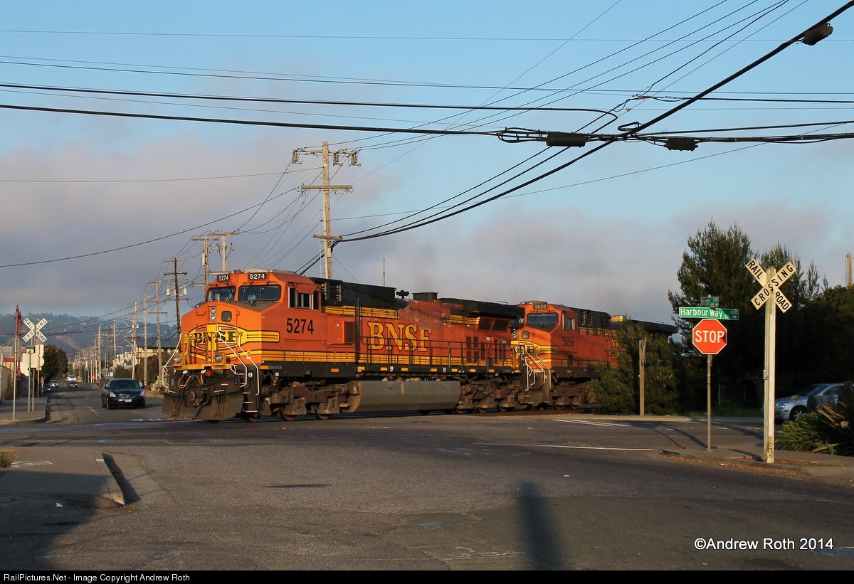 With only a short run down the Cal-P still remaining, BNSF 5274 and BNSF 5659 push a long stack across the intersection of Wright Avenue and Harbour Way on the Siberia Lead as the last of the evening light begins to fade. Someday in the distant future, scenes like this will be obsolete with the construction of a connector track between the UP and BNSF currently underway.