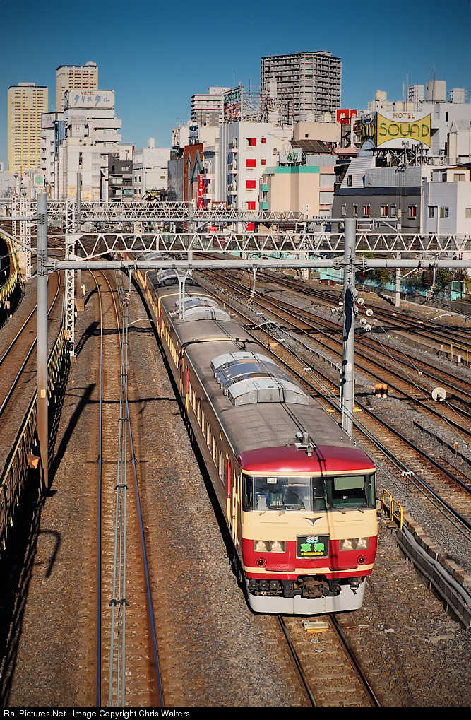 | Seven-car "Amagi"-liveried 185 Series set OM08 approaches its destination at Ueno Station, Tokyo, Japan. |