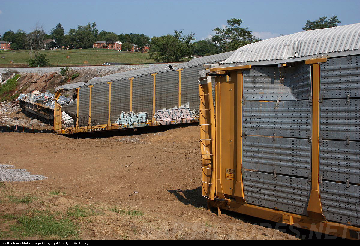 Destroyed autoracks rest in a field in Wytheville, VA in the aftermath of 23G's derailment here on July 15th, 2014.