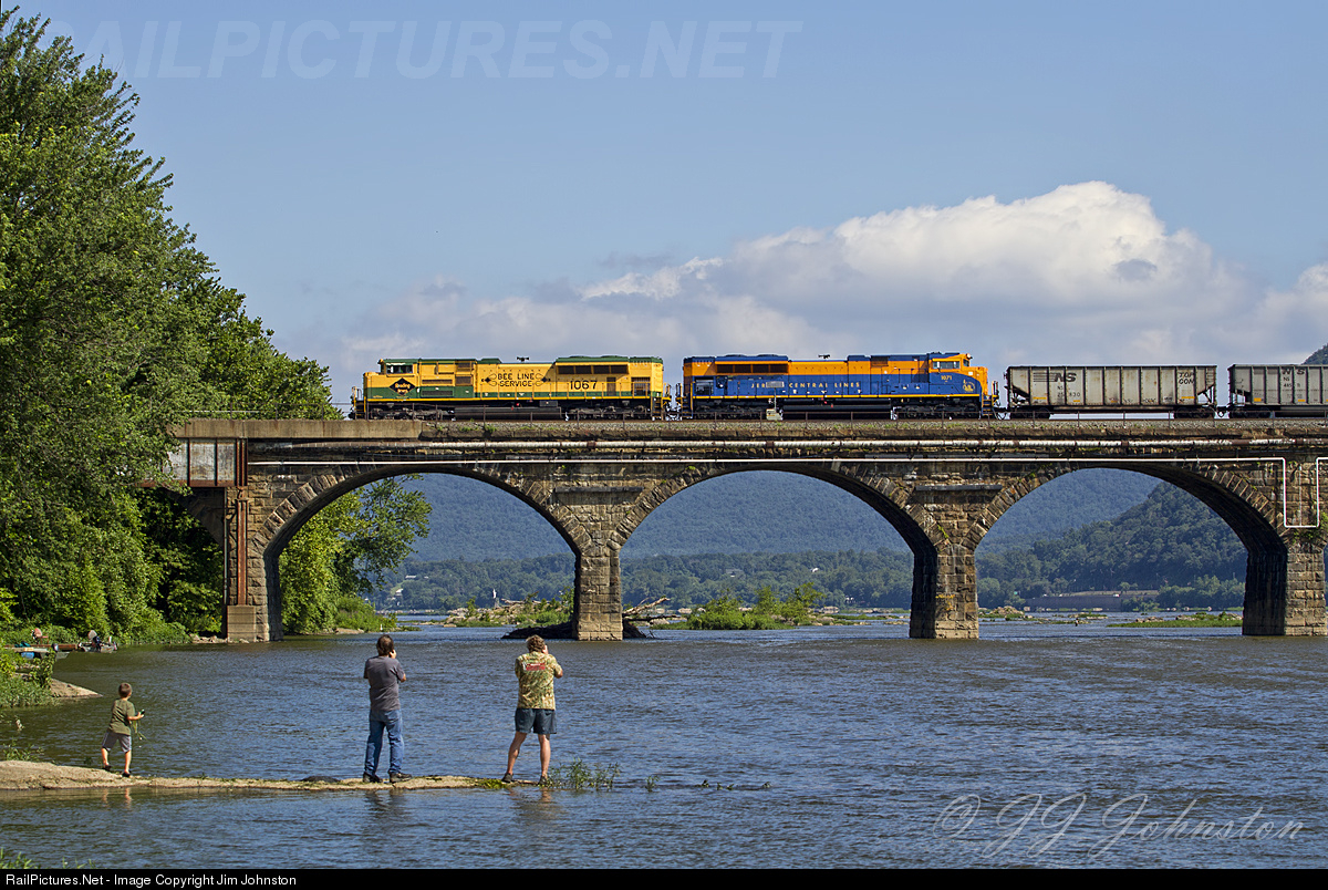 On a beautiful Summer day the NS 747 with the Reading NS 1067 and Central New Jersey NS 1071 heritage units race across the famed Rockville Bridge to the delight of photographers at waters edge.
