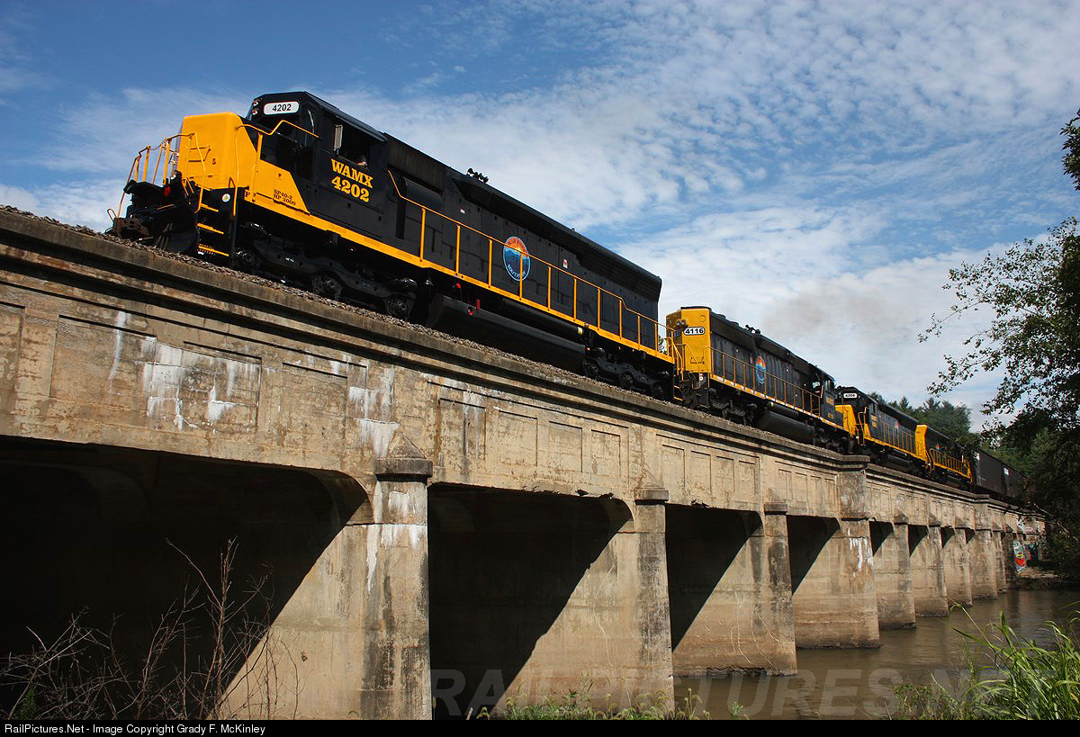 | Another beautiful afternoon in the mountains sees Watco's newest shortline, the Blue Ridge Southern crossing the French Broad River departing Asheville, NC for Canton. |