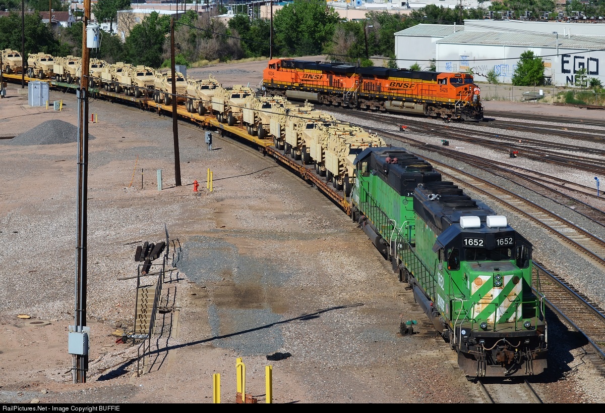 | BNSF 1652 (SD40-2) and team mate sort a long string of BAE Systems 'Caiman' MRAP vehicles, designed to withstand IED attacks. |