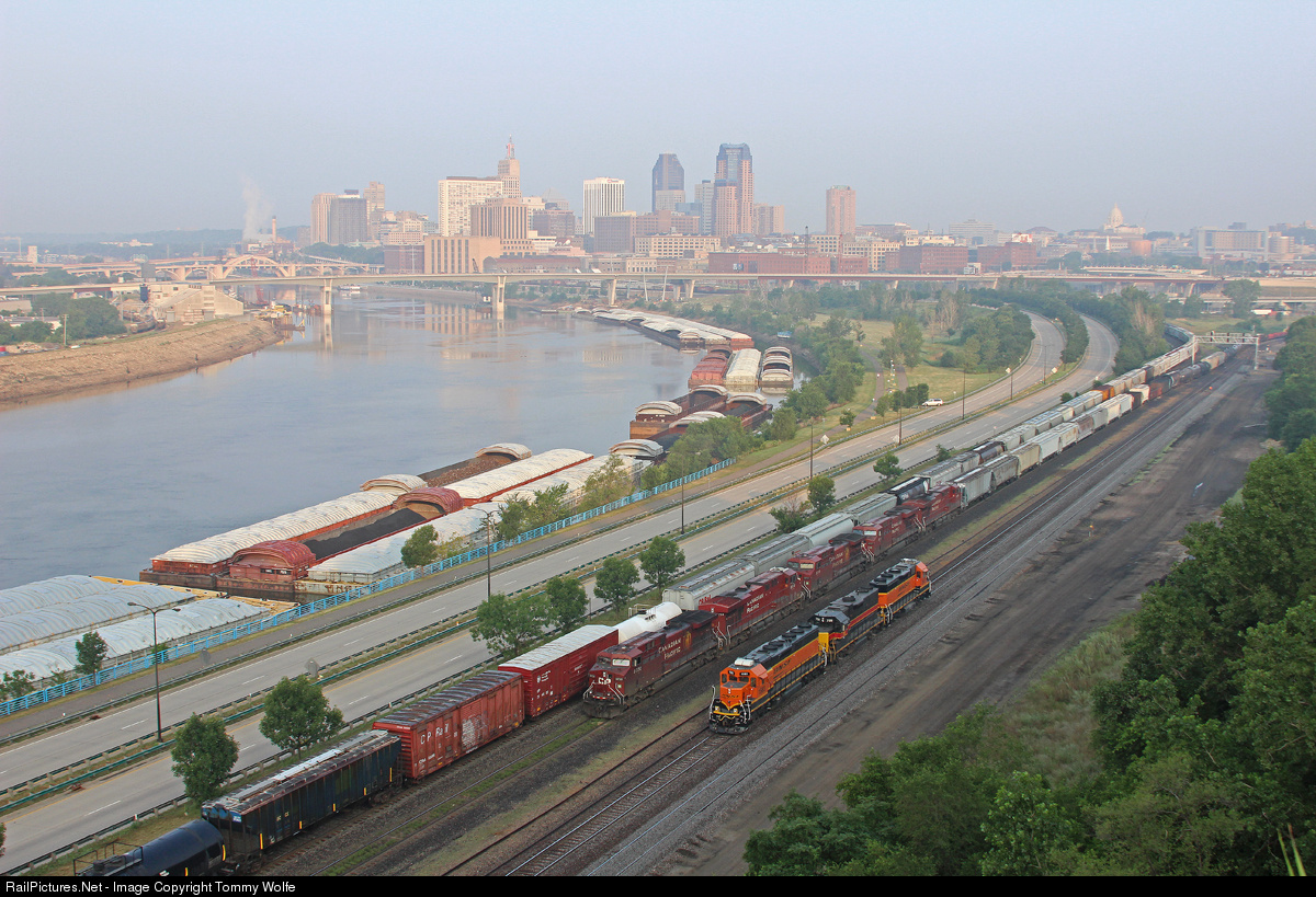 | As the first light of day hits off the high rises of St. Paul MN, A CP Road Freight is waiting to get clearance through the Plant while a BNSF Power Move is seen moving West Through Division. |