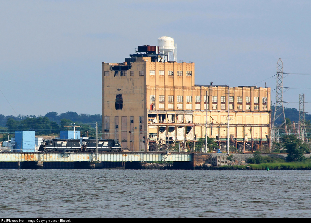 | More demolition work has recently been done to the E.H. Werner Power Station building, which includes the removal of the 4 smoke stacks. Click Here and Here for earlier views of the Power Station. OI-16 is returning light back across the Raritan River after delivering the daily supply train to Brown Yard. |