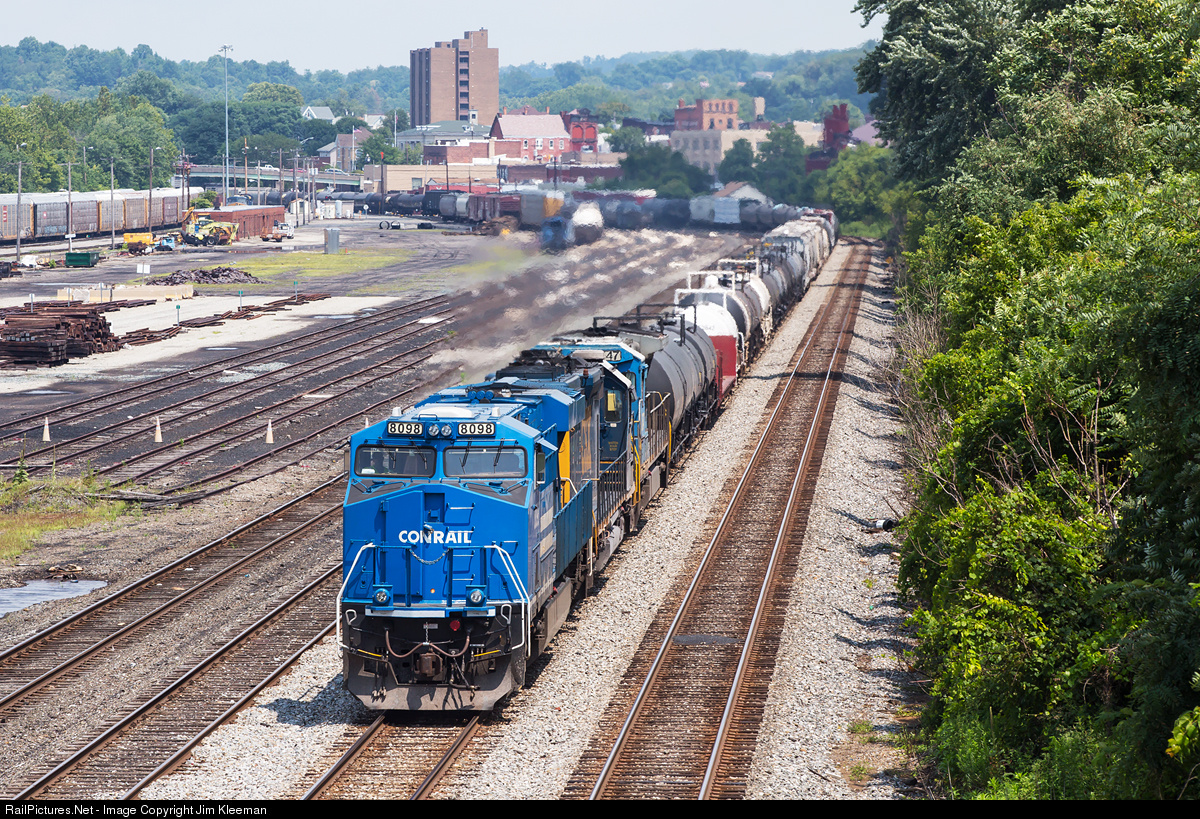 After changing crews at the "gas plant" west of town, the Conrail Heritage Unit leads CSX train Q368 through the yard at Connellsville, PA. It will stop at the yard office to water one of the engines. Theit will proceed east to Cumberland, MD along the former B&O mainline.